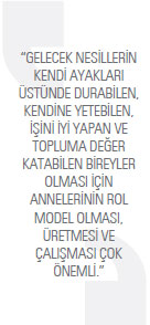 Kadınların iş hayatında, özellikle sanayi sektörlerinde daha fazla yer alması, ekonomik avantajın yanı sıra sosyal adalet, refah ve istikrarı da beraberinde getirecektir. Kadın- erkek olarak ayrım yapmanın çok doğru olduğunu düşünmüyorum. Sonuçta iş hayatında ve hayatta başarılı olmanın yolları erkek veya kadına göre değişmiyor. Kaldı ki, biz Türküz, özümüze baktığımızda çalışkan, güçlü ve iş bitirici analarımızın olduğunu unutmamak gerekir. Kadınlar birçok şeyi aynı anda yapabilme yetisine sahiptir. İyi bir eş, iyi bir anne ve iyi bir sanayici olabilirler. Çünkü güçlü, dengeli, çok yönlü ve hassas bir yapımız var. Allah vergisi bu yapıyı sadece kullanmayı bilmek gerek, içimizdeki cevheri çıkarmalıyız. Gelecek nesillerin kendi ayakları üstünde durabilen, kendine yetebilen, işini iyi yapan ve topluma değer katabilen bireyler olması için annelerinin rol model olması, üretmesi ve çalışması çok önemli.