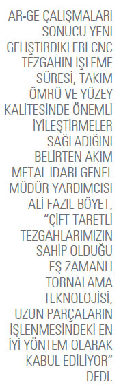 Bizim tezgahlarımızın ayrıcalığı yüksek adetli olan işlerde ortaya çıkıyor. Bugün yılda 1 milyon parça işleyen bir firmayı düşündüğümüzde o firmaya bir saniye bile kazandırmak, firmanın üretim verimliliğinde yüzde 5 ile yüzde 10 arası iyileşme sağlayabiliyor. Tezgahlarımızda kullandığımız bu teknolojiyle verimlilikte yüzde 30-70 arasında iyileşme sağlayabiliyoruz. Dünyada bu teknolojiye sahip tezgahları üreten birkaç firma var. Fakat söz konusu ürünlerin fiyatları oldukça yüksek. İşleme sürelerinde, takım ömründe ve yüzey kalitelerinde önemli iyileştirmeler sağlamasına rağmen yüksek bedellerinden ötürü, ülkemizde ve dünyada bu teknolojiye sahip tezgahların pazarı beklentilerin çok altında kalıyor. Akım Metal olarak ürettiğimiz tezgahlarla birkaç firmanın kontrolünde bulunan bu pazardaki tekeli kırmayı hedefliyoruz. Satış fiyatlarımız yabancı muadillerinin neredeyse 1/3’ü düzeyinde. Öncelikli hedefimiz yerli üreticilerimize ulaşarak onların gelişmesine ve büyümesine katkıda bulunmak. Bununla birlikte ürettiğimiz tezgahlarda otomasyon sistemine çok önem veriyoruz. Tüm tezgahlarımızı otomatik yükleme ve boşaltma sistemi entegre edilmiş olarak üretiyoruz.
