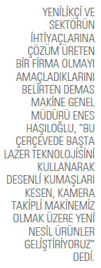 Demas olarak benimsediğimiz politika gereği ileriye dönük yenilikçi ve sektörün ihtiyaçlarına çözüm üreten bir firma olmayı hedefliyoruz. Bu bağlamda kumaşların hızlı ve hassas kesiminin yapılabilmesi sektörde ciddi bir ihtiyaç. Biz de firma olarak bu ihtiyacı karşılamak adına kuru bıçaklı kumaş kesim, rezistanslı kumaş kesim, ultrasonik kumaş kesim ve lazerle kumaş kesim makinelerini ürettik. Lazer teknolojisini kullanarak desenli kumaşları kesen, kamera takipli makinemizi TÜBİTAK’la birlikte geliştirdik.
