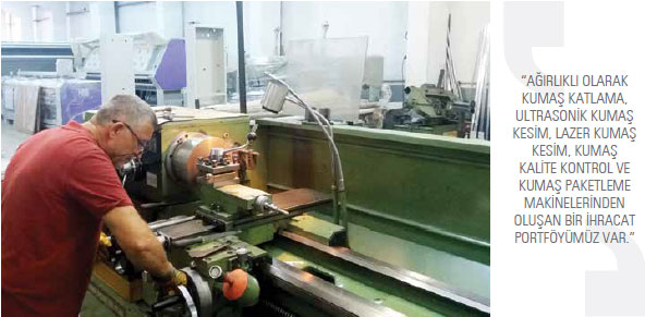 Ağırlıklı olarak kumaş katlama, ultrasonik kumaş kesim, lazer kumaş kesim, kumaş kalite kontrol ve kumaş paketleme makinelerinden oluşan bir ihracat portföyümüz var. Doğrudan müşteri irtibatlı ve mümessillik yoluyla olmak üzere yıllık üretimimizin yüzde 60’ını ihraç ediyoruz. İngiltere, İspanya ve İtalya ağırlıklı ihraç pazarlarımızı oluşturuyor. Ayrıca Mısır, Pakistan, Kazakistan