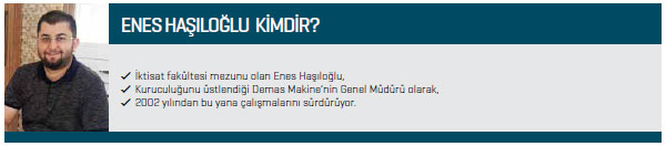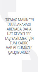 Dedemizin kurduğu firma, babamızın gayretleriyle belli bir düzeye ulaştı. Üçüncü kuşağı temsil eden yöneticiler olarak biz de Demas Makine’yi uluslararası arenada daha üst seviyelere taşıyabilmek için profesyonel yönetim anlayışıyla ve yaptığı işte tecrübeli bir kadroyla çalışıyoruz. Hedefimiz; sektörün ihtiyaç duyduğu fakat henüz ülkemizde üretilmemiş makine ihtiyaçlarını tespit edip kaliteli bir şekilde imal etmek.