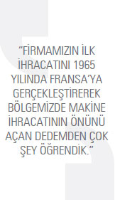 1965 yılında Dedem Dr. Ömer Lütfi Alaybeyi Fransa’ya ilk ihracatı gerçekleştirerek makineciliğin ve ihracatın öncüsü olmuş Konya’daki ilk üstattır. Konya’da makinecilik serüveni de bence böyle başladı. Bugün bölgemizde makinecilik çok gelişti. Firmamızdan ayrılan çok sayıda kişi kendi işini kurdu. Bu ailemiz ve firmamız adına gurur verici bir durumdur. Ancak özellikle sektörümüzde kaliteli ürün sunan firma sayısı çok az. Ayrıca Çin’in ucuz işçiliğinden yararlanıp fiyat kırarak ve kaliteden ödün vererek hizmet sunan firmaların bulunması da üzücü. Sektörümüzü manipüle ederek müşterileri yanıltan ucuz fiyat, düşük kalite anlayışının makinecilikte yeri yok. Dünya tarihine yön veren bir neslin torunları olarak kalite birincil hedefimiz olmalıdır.