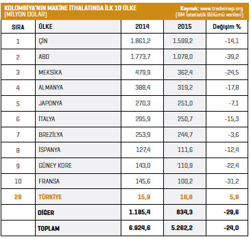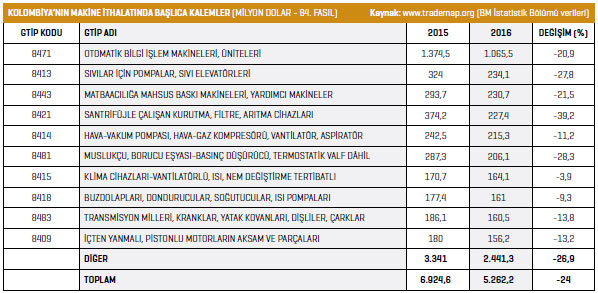 Kolombiya’nın 2016 yılı makine ithalatında Çin, ABD, Meksika, Almanya ve Japonya ilk beş ülke olarak sıralanırken, Türkiye, Kolombiya’nın makine ithalatı gerçekleştirdiği ülkeler içerisinde artış yakalayan nadir ülkelerden biri oldu ve 16,8 milyon dolarlık satışla 28’inci sırada yer aldı. Diğer yandan, ülkeler açısından Kolombiya’nın makine ithalatı incelendiğinde ilk 10 ülkenin tamamında düşüşler olduğunu da söylemeliyiz.
