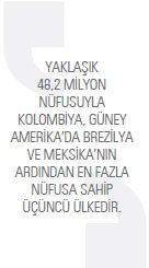 Yaklaşık 48,2 milyon nüfusuyla Kolombiya, Güney Amerika’da Brezilya ve Meksika’nın ardından en fazla nüfusa sahip üçüncü ülkedir. Nüfus artış hızı yüzde 1 olan ülkenin yaş ortalaması ise 29,3; 30 yaşın altındaki nüfusun oranı ise yüzde 55 olarak ölçülüyor.