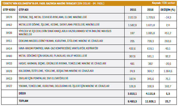Diğer yandan, BM İstatistik Bölümü verilerine göre Türkiye, Kolombiya’nın makine ithalatında 2016 yılında artış sağlayan nadir ülkelerden biri oldu ve Kolombiya’ya makine ihracatını yüzde 5,9 seviyesinde artırarak 16,8 milyon dolarlık makine ihracatı gerçekleştirdi. TÜİK verilerine göreyse, Türkiye’nin 2016’da Kolombiya’ya 84’üncü fasılda gerçekleştirdiği ihracat yüzde 25,7 artışla 11,9 milyon dolar oldu.