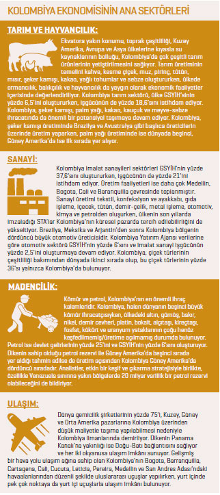 Benzer şekilde, Kolombiya, 2016 yılı ithalatının yüzde 26,6’sını ABD’den gerçekleştirirken, aynı yıl Çin, Kolombiya’nın ithalatında yüzde 19,2 pay ile ikinci, Meksika yüzde 7,6 ile üçüncü, Brezilya yüzde 4,7 ile dördüncü ve Almanya yüzde 3,8 ile beşinci sırada yer aldı. Türkiye, bu sıralamada 2016 yılında yüzde 0,5 pay ile 24’üncü sırada yer alıyor. Kolombiya’nın başlıca ihraç ürünlerini madencilik ve tarım ürünleri oluştururken, ülkenin 2016 yılı ihracatı ağırlıklı olarak yüzde 25,8 ile ham petrol, yüzde 14,2 ile taş kömüründen elde edilen katı yakıtlar, yüzde 7,9 ile kahve, yüzde 6,4
