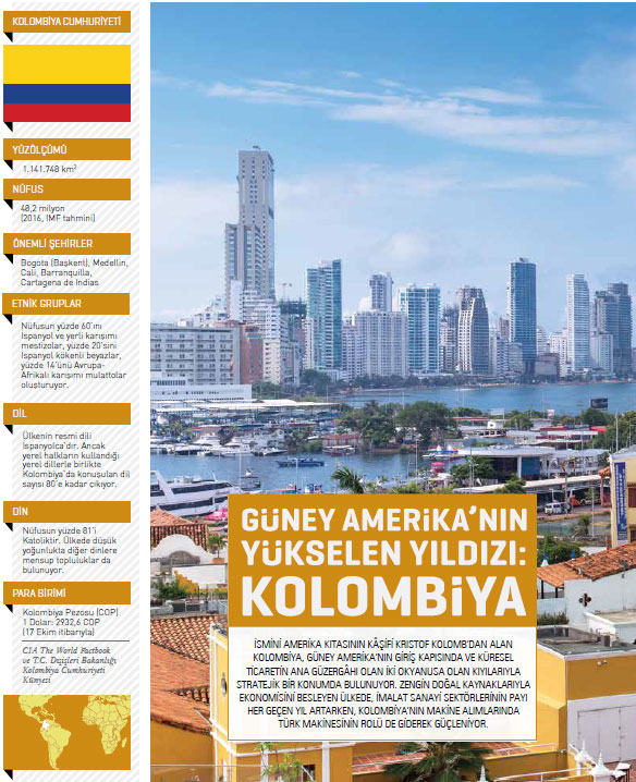 Halen gelişimini sürdüren Kolombiya ekonomisi ve sanayisi, tekstil, otomotiv, tarım ürünlerinin işlenmesi ve madencilik faaliyetleriyle büyümeye devam ediyor. Ancak sanayi sektörlerinin GSYİH içindeki payı yüzde 37,6 seviyelerinde gerçekleşse de BM İstatistik Bölümü verilerine göre Kolombiya’nın makine ithalatı 2016’da yüzde 24’lük bir kayıpla 5,2 milyar dolar olarak gerçekleşti. Toplam ithalat içerisindeki makine sektörünün payı da yüzde 12,8’den yüzde 11,7’ye geriledi.