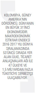 Kolombiya, Güney Amerika’nın dördüncü, dünyanın 31’inci büyük ekonomisidir. 2016-2017 yılı Makroekonomik İstikrar Endeksi’nde 53’üncü sırada yer alan ülke, imzaladığı STA’lar ile 47 ülke ve 1,5 milyardan fazla tüketiciye imtiyazlı olarak ulaşabiliyor. BM İstatistik Bölümü verilerine göre 44,9 milyar dolarlık ithalat ve 30,9 milyar dolarlık ihracat gerçekleştiren ülke halen 293 milyar dolarlık GSYİH’ye ve kişi başı 6 bin dolardan fazla bir milli gelire sahip bulunuyor. Ülke GSYİH’sinin yüzde 155 artışla 2050 yılında 725 milyar dolara ulaşacağı; kişi başı gelir, nüfus ve yatırım göstergelerinde de önemli ölçüde gelişme kaydedileceği öngörülüyor.