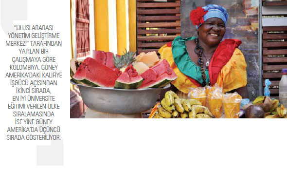 Kolombiya, 23,7 milyon civarındaki toplam işgücü ile dünyada 28’inci sırada yer alırken, işgücünün yüzde 17’si tarım, yüzde 21’i sanayi ve yüzde 62’si hizmetler sektöründe istihdam ediliyor. Bununla birlikte, Kolombiya, merkezi İsviçre Lozan’da bulunan “Uluslararası Yönetim Geliştirme Merkezi” tarafından yapılan bir çalışmaya göre, Güney Amerika’daki kalifiye işgücü açısından ikinci sırada, en iyi üniversite eğitimi verilen ülke sıralamasında ise yine Güney Amerika’da üçüncü sırada gösteriliyor. Benzer şekilde, PwC tarafından yapılan bir çalışmaya göre de Kolombiya, Güney Amerika’nın en üretken işgücüne sahip ve çalışma saatlerinin en uzun olduğu ülkesi olarak dikkat çekiyor.