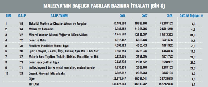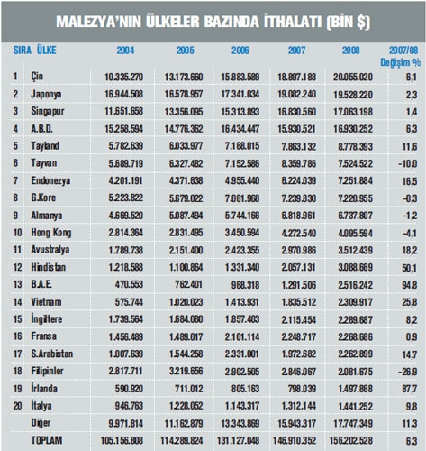 Malezya’nın ithalatı yüzde 6,3 artarak 2008 yılında 156,2 milyar dolara ulaştı. Aynı yılda ülkenin genel ithalatında en çok payı alan ilk üç ülke sırasıyla Çin, Japonya ve Singapur’dur. Malezya’nın ithalatında en büyük payı alan ilk 20 ülke arasında en çok artış kaydedilen ülkeler ise sırasıyla; Birleşik Arap Emirlikleri, İrlanda ve Hindistan’dır. Önemli ithalat kalemleri ise “elektrikli makine ve cihazlar, aksam ve parçaları”, “makine ve aksamları”, “mineral yakıtlar ve yağlar”dır.
