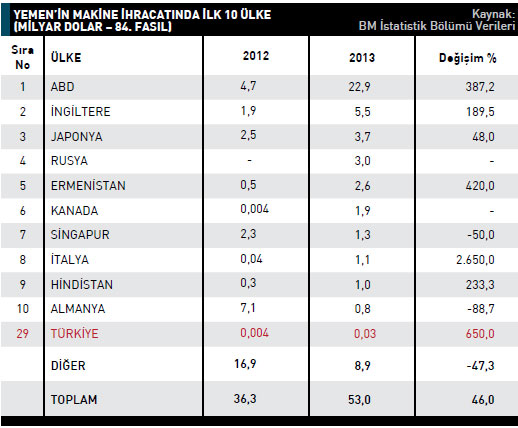 makine ihraç edilirken bu rakam, 2012 yılında yüzde 189,5 artışla 5,5 milyon dolar olarak kaydedildi. Yemen’in en fazla makine ihraç ettiği ilk 10 ülke listesinin üçüncü sırasında ise Japonya yer alıyor. 2012 yılında Japonya’ya 3,7 milyon dolar değerinde makine ihraç edildi. 2011 yılında Yemen’in Japonya’ya gönderdiği makinelerin değeri 2,5 milyon dolardı. 2012 yılında Japonya’ya yönelik makine ihracatındaki artış yüzde 48 olarak kaydedildi. Yemen’in 2012 yılında bir önceki yıla göre makine ihracatını en fazla artırdığı ülke ise yüzde 2.650 ile İtalya oldu. İtalya’ya 2011 yılında 4 bin dolarlık makine ihraç edilirken bu rakam 2012 yılında 1,9 milyon dolar olarak kaydedildi. Yemen’in Türkiye’ye yönelik makine ihracatı 2011 yılında 4 bin dolar seviyesindeyken bu rakam 2012 yılında, yüzde 650 artışla 30 bin dolar değerinde kaydedildi. Türkiye, Yemen’in en fazla makine ihraç ettiği ülkeler listesinin 29. sırasında yer alıyor. Yemen 84. fasılda en fazla, özellikle 84.31 ila 84.08 pozisyonlarındaki makine ve cihazlar ile birlikte kullanılmaya elverişli aksam ve parçalar kaleminde ihracat gerçekleştirdi. 2011 yılında söz konusu ürün grubunda 13 milyon dolarlık ürün ihraç edilirken bu rakam, 2012 yılında yüzde 7,7 artışla 14 milyon dolar seviyesine yükseldi. Listenin ikinci sırasında ise sıkıştırmayla ateşlemeli içten yanmalı pistonlu motorlar (dizel ve yarı dizel) ürün grubu bulunuyor. Söz konusu kalemde 2012 yılında gerçekleştirilen ihracatın değeri 6 milyon dolar olarak kaydedildi. 2011 yılında bu rakam 100 bin dolar seviyesindeydi. Listenin üçüncü sırasında bulunan buldozerler, greyderler, toprak tesviye makineleri, skreyperler, mekanik küreyiciler, ekskavatörler kaleminde 2011 yılında 2 milyon dolar değerinde ihracat gerçekleştirilirken bu rakam, 2012 yılında yüzde 200 artışla 6 milyon dolar seviyesine yükseldi. Yemen’in 2012 yılında bir önceki yıla oranla ihracatını en fazla artırdığı ürün grubu yüzde 1900 ile hava-vakum pompası, hava/gaz kompresörü, vantilatör, aspiratör oldu. Söz konusu kalemde 2011 yılında 100 bin dolarlık ihracat gerçekleştirilirken bu rakam 2012 yılında 2 milyon dolar olarak kaydedildi.