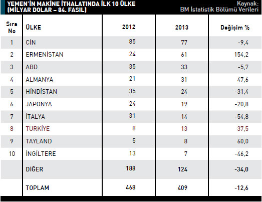 Yemen’in makine ithalatı 2012 yılında bir önceki yıla oranla yüzde 12,7 azalarak 409 milyon dolar olarak kaydedildi. 2011 yılında bu rakam 468 milyon dolar seviyesindeydi. 2012 yılı rakamlarına göre Yemen’in en fazla makine ithal ettiği ilk 10 ülke listesinin ilk sırasında Çin bulunuyor. Çin’den 2011 yılında 85 milyon dolar değerinde makine ithal eden Yemen’in, 2012 yılı makine ithalatı yüzde 9,4 azalarak 77 milyon dolar olarak kaydedildi. Yemen 2012 yılında listenin ikinci sırasında bulunan Ermenistan’dan 61 milyon dolar değerinde makine ithal etti. 2011 yılında bu rakam 24 milyon dolar seviyesindeydi. 2012 yılında Yemen’in Ermenistan makine ithalatındaki artış yüzde 154,2 olarak kaydedildi. Yemen’in 2012 yılında en fazla makine ithal ettiği ilk 10 ülke listesinin üçüncü sırasında ise ABD yer alıyor. 2011 yılında ABD’den 35 milyon dolar değerinde makine ithal ederken bu rakam, 2012 yılında yüzde 5,7 oranında azalarak 33 milyon dolar olarak kaydedildi. Yemen’in 2012 yılında bir önceki yıla oranla makine ithalatını en fazla artırdığı ülke yüzde 154,2 ile Ermenistan oldu. Türkiye, Yemen’in en fazla makine ithal ettiği ülkeler listesinin 8. sırasında bulunuyor. 2011 yılında Türkiye Yemen’e 8 milyon dolar değerinde makine ihraç ederken bu rakam 2012 yılında, yüzde 37,5 artarak 13 milyon