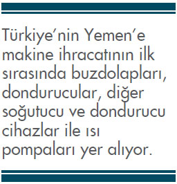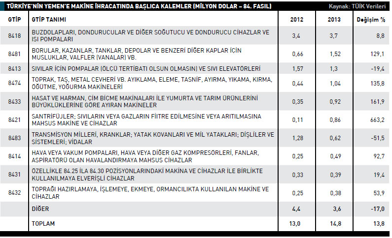Türkiye’nin 84. fasılda Yemen’e gerçekleştirdiği makine ihracatı, 2013 yılında 14,8 milyon dolar olarak kaydedildi. 2012 yılında bu rakam 13 milyon dolar seviyesindeydi. Yemen’e yönelik ihracat artışı yüzde 13,8 oldu. Türkiye’nin Yemen’e yönelik makine ihracatının ilk sırasında buzdolapları, dondurucular, diğer soğutucu ve dondurucu cihazlar ile ısı pompaları yer alıyor. Söz konusu kalemde Yemen’e 2012 yılında 3,4 milyon dolarlık ihracat gerçekleştirilirken bu rakam 2013 yılında, yüzde 8,8 artışla 3,7 milyon dolar seviyesine yükseldi. Listenin ikinci sırasında bulunan borular, kazanlar, tanklar, depolar ve benzeri diğer kaplar için musluklar, valfler (vanalar) vb. ürün grubunda 2013 yılında gerçekleştirilen ihracatın değeri 1,5 milyon dolar olarak kaydedildi. 2012 yılında bu rakam 700 bin dolardı. Söz konusu kalemdeki ihracat artışı yüzde 130,3 oldu. Türkiye’nin Yemen’e makine ihracatında ilk 10 listesinin üçüncü sırasında ise sıvılar için pompalar (ölçü tertibatı olsun olmasın) ve sıvı elevatörleri bulunuyor. 2012 yılında söz konusu kalemde 1,6 milyon dolarlık ihracat gerçekleştirilirken bu rakam, 2013 yılında yüzde 17,2 azalarak 1,3 milyon dolar olarak kaydedildi. 2013 yıl