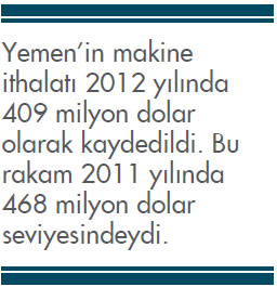Türkiye ile tarihsel bağlara sahip bir ülke olan Yemen’e makine ihracatımız 2013 yılında yüzde 14,1 artarak 14,8 milyon dolara yükseldi. Genç nüfusuyla dikkat çeken Ortadoğu’nun az gelişmiş ülkesi Yemen, bölge ülkelerinin desteğiyle siyasi ve ekonomik sorunlarını çözerek, sanayileşmeyi hedefliyor.