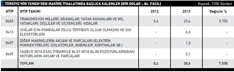 2013 yılında 84. fasıl itibariyle Türkiye’nin Yemen’den ithalatının ilk sırasında transmisyon milleri, kranklar; yatak kovanları ve mil yatakları; dişliler ve sistemleri; vidalar yer alıyor. Söz konusu ürün grubunda 2012 yılında 0,4 bin dolarlık ithalat gerçekleştirilirken bu rakam, 2013 yılında yüzde 6 artışla 23,4 bin dolar oldu. İthalat listesinin ikinci sırasında yer alan sıvılar için pompalar (ölçü tertibatı olsun olmasın) ve sıvı elevatörleri kaleminde 2012 yılında ithalat gerçekleştirilmezken 2013 yılında 6 bin dolar değerinde ürün ithal edildi. Türkiye’nin Yemen’den makine ithalatının üçüncü sırasında diğer makinelerin aksam ve parçaları (elektrik konektörleri, izolatörler, bobinler, kontaklar vb.) bulunuyor. Söz konusu kalemde 2012 yılında ithalat gerçekleştirilmezken 2013 yılında 1000 dolarlık ürün ithal edildi. 2013 yılında Türkiye’nin Yemen’den makine ithalatında en fazla artış transmisyon milleri, kranklar; yatak kovanları ve mil yatakları; dişliler ve sistemleri; vidalar ürün grubunda gerçekleşti. Türkiye’nin 2012 yılında Yemen’den gerçekleştirdiği makine ithalatı 0,4 bin dolar seviyesindeyken bu rakam 2013 yılında yüzde 7.550 artarak 30,6 bin dolar olarak kaydedildi.