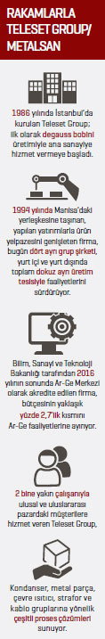 büyüyerek ürün yelpazesini genişleten firmamız, bugün dört ayrı grup şirketi, yurt içi ve yurt dışında toplam dokuz ayrı üretim tesisiyle faaliyetlerini sürdürüyor. 2 bine yakın çalışanıyla ulusal ve uluslararası pazardaki müşterilere hizmet veren Teleset Group; kondanser, metal parça, çevre ısıtıcı, strafor ve kablo gruplarına yönelik çeşitli proses çözümleri sunuyor” diyor. Bilim, Sanayi ve Teknoloji Bakanlığı tarafından 2016 yılının son haftasında yapılan denetimlerin ardından Ar-Ge merkezi olarak tescil edildiklerini söyleyen Hanoğlu, sektörde sahip oldukları yetkinliği Ar-Ge merkezleri sayesinde artıracaklarını vurguluyor.