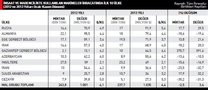 2013 yılı Ocak-Kasım döneminde inşaat ve madencilikte kullanılan makineler, aksam ve parçaları sektöründe 1 milyar 35 bin dolar değerinde ürün ihraç edildi. Yüzde 3,4 artışın yaşandığı sektörün 2012 yılının aynı döneminde ihraç ettiği ürünlerin değeri 1 milyar dolardı. İnşaat ve madencilikte kullanılan makineler, aksam ve parçaları sektöründe Rusya, 2013 yılının Ocak-Kasım döneminde 91,9 milyon dolarla en fazla ihracat gerçekleştirilen ülke oldu. Bir önceki yıla göre yüzde 29,5 artışın yaşandığı Rusya’ya 2012 yılının aynı döneminde 70,9 milyon dolarlık ürün gönderilmişti. Listenin ikinci sırasında yer alan Almanya’ya 2013 yılının Ocak- Kasım döneminde ihraç edilen ürünlerin değeri 79,4 milyon dolar olarak kaydedildi. Üçüncü sıradaki Ege Serbest Bölgesi’ne 2012 yılının Ocak-Kasım döneminde 59,1 milyon dolar değerinde inşaat ve madencilikte kullanılan makineler, aksam ve parçaları ihraç edilirken bu rakam yüzde 21,6 artışla, 2013 yılının aynı döneminde 71,9 milyon dolar oldu. Listenin dördüncü sırasında bulunan Irak’a 2013 yılının Ocak-Kasım döneminde 68,9 milyon dolar değerinde ürün gönderildi. Yüzde 20,3 artışın yaşandığı Irak’a 2012 yılının aynı döneminde ihraç edilen ürünlerin değeri 57,3 milyon dolardı. Beşinci sırada yer alan Gaziantep Serbest Bölgesi’ne 2012 yılının Ocak-Kasım döneminde 13,1 milyon dolarlık ihracat gerçekleştirilirken bu rakam, 2013 yılının aynı döneminde yüzde 391,6 artarak 64,5 milyon dolar seviyesine yükseldi. Türkiye geneli inşaat ve madencilikte kullanılan makineler, aksam ve parçaları ihracatı listesinde en fazla artış yüzde 391,6 ile Gaziantep Serbest Bölgesi’nde yaşandı. Listede yüzde 32,2 ile Suudi Arabistan ikinci sırada bulunurken bu ülkeyi yüzde 29,5 ile Rusya üçüncü sırada izledi.