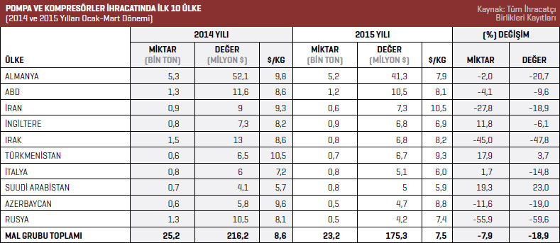 Pompa ve kompresörler mal grubunda 2015 yılının Ocak-Mart döneminde 175,3 milyon dolar değerinde ihracat gerçekleştirildi. Pompa ve kompresörler ürün grubunda, 2015 yılının Ocak-Mart döneminde en fazla ihracat gerçekleştirilen ülke 41,3 milyon dolarla Almanya oldu. Listenin ikinci sırasında bulunan ABD’ye 2015 yılının Ocak-Mart döneminde gönderilen ürünlerin değeri 10,5 milyon dolar olarak kaydedildi. Üçüncü sıradaki İran’a 2015 yılının Ocak-Mart döneminde ihraç edilen ürünlerin değeri 7,3 milyon dolar olarak kaydedildi. Dördüncü sıradaki İngiltere’ye 2015 yılının Ocak-Mart döneminde pompa ve kompresörler kaleminde ihraç edilen ürünlerin değeri 6,8 milyon dolar oldu. Beşinci sırada bulunan Irak’a da 2015 yılının Ocak-Mart döneminde 6,8 milyon dolar değerinde ürün ihraç edildi.