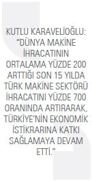 Kutlu Karavelioğlu ise “Büyüme Makinesi” iletişim kampanyasının tanıtım toplantısında yaptığı sunumda, ekonomik belirsizliklerin dünya genelinde bir istikrarsızlık yarattığı 2016 yılının Ocak- Ekim döneminde, Türk makine sektörünün 11 milyar dolar ihracat gerçekleştirdiğinin altını çizdi. Bu rakamın 2015 yılının aynı dönemine göre yüzde 1,4’lük büyüme sağladığını ifade eden Karavelioğlu, dünya makine ihracatının ortalama yüzde 200 arttığı son 15 yılda Türk makine sektörünün ise ihracatını yüzde 700 oranında artırarak Türkiye’nin ekonomik istikrarına katkı sağlamaya devam ettiğini vurguladı. Sunumunda, 2014 yılında dünya mal ticaretinin 18,9 trilyon dolar olduğu ve bunun yüzde 16’sının makine sektörü tarafından gerçekleştirildiği bilgisini de anımsatan Kutlu Karavelioğlu, petrolü olmayan ülkelerin makine üretmek zorunda olduklarının altını çizdi ve “Makine, diğer bütün sektörlerin tedarikçisidir. Teknolojik çözüm ortağıdır. Aslında herhangi bir imalat sanayisinin teknolojisini geliştiren sektör, makine sektörüdür. Dolayısıyla makine sektörü diğer tüm sektörlerden daha yüksek katma değerlidir. Gelişmiş ülkelerde makine sektörünün ihracat payının yüzde 15-20 seviyelerinde olmasının nedeni de budur” değerlendirmesinde bulundu.