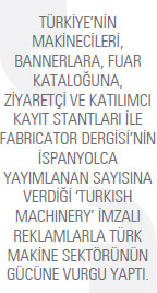 Türkiye’nin Makinecileri, fuar girişinde yer alan bannerlara, fuar kataloğuna, ziyaretçi ve katılımcı kayıt stantları ile Fabricator Dergisi’nin İspanyolca yayımlanan sayısına verdiği “Turkish Machinery” imzalı İspanyolca reklamlarla Türk makine sektörünün gücüne vurgu yaptı. Türkiye’nin Makinecileri ayrıca fuara katılan Türk firmalarının stant numaraları ve ürün tanıtımlarını içeren broşür de hazırlayarak ziyaretçilere dağıttı. Makine İhracatçıları Birliği (MAİB) üyesi firmaların ve Makine Sanayii Sektör Platformu (MSSP) üyesi derneklerin broşürlerinin yanı sıra, Türkiye’nin makine ihracatı verilerini içeren broşürler de Türkiye’nin Makinecileri’nin standında fuar ziyaretçilerine sunuldu. Fuara MAİB ve Türkiye’nin Makinecilerini temsilen Yönetim Kurulu Üyesi Mehmet Ağrikli ile Makine Şube Müdürü Mehtap Önal ile Uzman Yardımcısı Aybüke Tuğçe Karabörk katıldı. Makine alt sektör derneklerini kendi ihtisas fuarlarında desteklemeye devam eden Türkiye’nin Makinecilerinin standında, MSSP üyesi derneklerden AKDER (Akışkan Gücü Derneği), MİB (Makine İmalatçıları Birliği) ve ENOSAD (Endüstriyel Otomasyon Sanayicileri Derneği) temsilcileri de hazır bulunarak ziyaretçileri, sektörleri ve üyeleri hakkında bilgilendirdi.