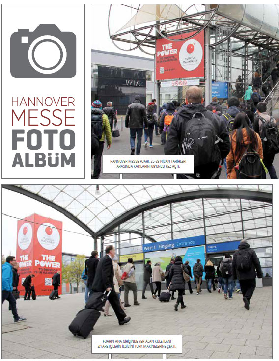 Her yıl düzenlenen ve dünyanın en önemli endüstri teknolojileri fuarları arasında yer alan Hannover Messe, 25-29 Nisan tarihleri arasında kapılarını 69’uncu kez katılımcılara ve ziyaretçilere açtı. 75 ülkeden 5 bin 200 firmanın katıldığı fuarda 135 Türk firması da yerini aldı. Ev sahibi Almanya’nın yanında bu yıl fuarın partner ülkesiyse “Select USA” sloganıyla ABD oldu. Türkiye’nin Makinecileri’nin yıllardır devam eden başarılı çalışmalarının sonucu olarak bu seneki organizasyonda da ilgi odağı hale gelen Türkiye, fuara en fazla firmayla katılan beşinci ülkeydi. Türkiye’nin Makinecileri, 5’inci holdeki standında ziyaretçilerine Türk makine sektörü hakkında bilgi verirken, havaalanı ve fuar alanının çeşitli yerlerindeki reklam çalışmalarıyla da dikkatlerin Türk makine sektörünün üzerine yoğunlaşmasını sağladı. “Turkish Machinery” logosuyla hazırlanan reklamlar havaalanından başlayarak, fuar alanında, reklam kulelerinde, küp ilanlarda, otobüslerde, taksi duraklarında, billboardlarda, fuar kataloğu ve fuar gazetesi Messe Daily’de yer aldı. Türkiye’nin Makinecileri gerçekleştirdiği yaygın ve etkili reklam çalışmalarıyla fuarı ziyaret eden 190 bin kişinin, Türk makinesinin kalitesi ve avantajları hakkında bilgi sahibi olmasını sağladı. Ayrıca fuara katılan Türk firmalarının hollerini ve stant numaralarını gösteren el ilanları ile üye bilgileri ve sektör verileri içeren broşür de Türkiye’nin Makinecileri’nin standında ziyaretçilere dağıtıldı.