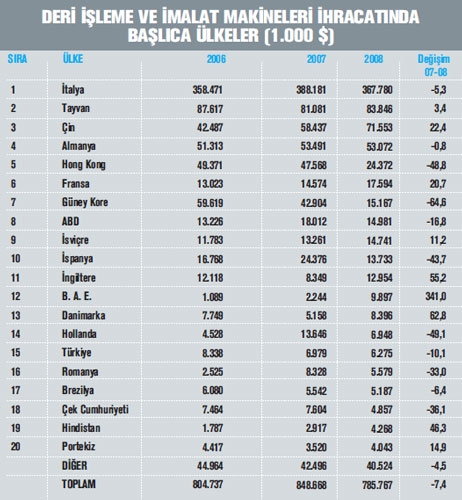 2007 yılında tüm ülkelere yapılan ihracat değeri bazında, en yakın rakibinin dört katından fazla paya sahip olan İtalya’nın 2008 yılı ihracatı yüzde 5,3 azalıp 367,8 milyon dolar seviyesine indi ancak bu düşüşe rağmen İtalya ilk sıradaki konumunu korudu. Bu ülkeyi 83,8 milyon dolar ile Tayvan ve 71,6 milyon dolar ile Çin takip ediyor. Deri işleme ve imalat makineleri ihraç eden ilk 20 ülke arasında en fazla ihracat artışını yüzde 341 ile B.A.E. gösterirken, en fazla düşüş yaşayan ülke ise Güney Kore (yüzde 64,6) oldu.