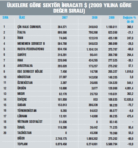 Birleşmiş Milletler (BM) İstatistik Bölümü verilerine göre, 2007 yılında 848,7 milyon dolar olan sektör ihracatı yüzde 7,4 oranında düşüş göstererek 2008 yılında 785,8 milyon dolar değerine gerildi.