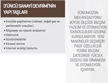 Üçüncü Sanayi Devrimi, İkinci Dünya Savaşı sonrası başlayan ve 1970’li yıllardan sonra ivmesi artan, üretimin sayısallaştığı, bilişim teknolojisi dönemi olarak da adlandırılıyor. Bununla birlikte, Üçüncü Sanayi Devrimi de benzer şekilde yeni bir enerji kaynağının kullanılmasıyla tetiklenen bir süreç olarak değerlendirilebilir. İkinci Dünya Savaşı’nı sona erdiren nükleer güç, devam eden yıllarda bir yıkım aracı olmaktan çıkarak bir enerji ham maddesi olarak yoğun ilgi gördü. Diğer yandan insanoğlunun hesap makinesinden evrimleştirdiği ve temelde yine ihtiyaç duyulan karmaşık hesapları yapma amacıyla geliştirdiği “bilgisayarlar” da Üçüncü Sanayi Devrimi’nin altyapısında önemli bir mihenk taşı olarak yer aldı. Bilgisayarların işlem gücünün hızla artması “akıllı makineleri” doğururken, robotik endüstrinin ani ve çabuk atılım göstermesi, ilk kez üretimde insan gücünün azalmasına ve robot makinelerin insanların yerine üretimde daha fazla kullanılmasına neden oldu. Halen devam eden bu süreçte en temel kavram ise kuşkusuz bilgidir. Sosyal refahın artması ve yükselen eğitim seviyesi ile bilginin üretilmesi, yayılması ve toplumlar tarafından hızla kabul edilmesi, adına küreselleşme dediğimiz sanayi toplumundan bilgi toplumuna ilerleyen kültürel bir dönüşümün yakıtı olmaya da devam ediyor.