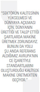 Sektörün kalitesinin yükselmesi ve dünyaya açılması için, dünyanın ürettiği ve talep ettiği şartlarda makine üretmek zorundayız. Bunun da yolu şu anda referans aldığımız Avrupa’nın CE işaretiyle standartlarını oluşturduğu kalitede makine üretmekten geçiyor. AB standartlarına sahip makineler üretmeye mecburuz. İç pazarda herkes makine imal ediyor. Herkesin ürettiği makine de maalesef alıcı buluyor. Makineyi satan, kalite standartlarını sağlama noktasında kendini zorunlu hissetmiyor. Makinelerin müşterileri de CE standartlarında olup olmadığını sorgulamıyor. Dolayısıyla ortada standartlar konusunda bir problem söz konusu. Öncelikle sektör olarak bu sorunu çözmemiz gerekiyor.