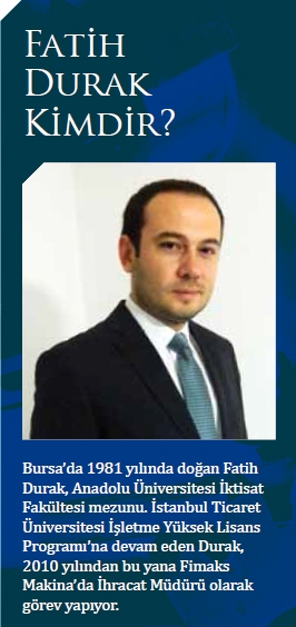 Bursa’da 1981 yılında doğan Fatih Durak, Anadolu Üniversitesi İktisat Fakültesi mezunu. İstanbul Ticaret Üniversitesi İşletme Yüksek Lisans Programı’na devam eden Durak, 2010 yılından bu yana Fimaks Makina’da İhracat Müdürü olarak görev yapıyor.