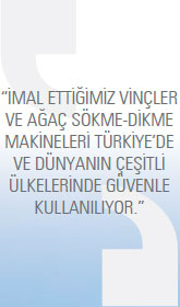 Çağımızın gerektirdiği kaliteyi ve teknolojiyi ürünlerine yansıtan firmamız, Ar-Ge çalışmaları sayesinde yenilikçi ürünleriyle sektöründe ön sıralarda bulunuyor. Ürün grubumuzu geliştirmek ve daha üstün nitelikli ürünler imal etmek amacıyla Ar-Ge ve inovasyon çalışmalarımıza sürekli devam ediyoruz. Vinçlerimiz, ülkemizin ve dünyanın her noktasında her türlü yükleme ve kaldırma işlerinde; ağaç sökme-dikme makinelerimiz ise yetiştirilmesi onlarca yıl alan ve çevreye en büyük katma değer sağlayan ağaçların zarar görmeden taşınmasında kullanılan önemli birer araçtır.