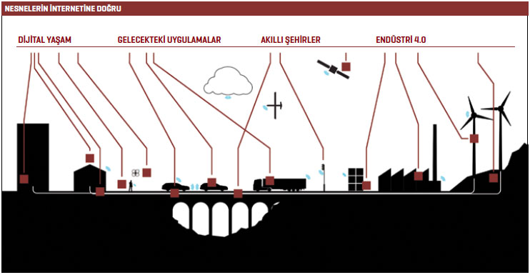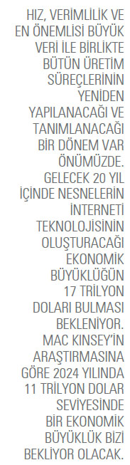 Nesneler arası internet, robotlar ve otomasyonun alt yapısı olacak. Hız, verimlilik ve en önemlisi Büyük Veri (Big Data) ile birlikte bütün üretim süreçlerinin yeniden yapılanacağı ve tanımlanacağı bir dönem var önümüzde. Önümüzdeki 20 yıl içinde bu teknolojinin oluşturacağı ekonomik büyüklüğün 17 trilyon dolar olması bekleniyor. McKinsey&Company’nin araştırmasına göre ise 2024 yılında 11 trilyon dolar seviyesinde bir ekonomik büyüklük bizi bekliyor olacak.