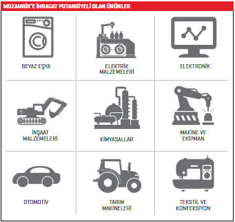 a yer alan verilere göre; ülkenin kuzey bölgesinde çıkarılmaya başlanacak olan doğal gaza yönelik, toplam yatırım bedeli yaklaşık 30 milyar dolar olması beklenen, sıvılaştırma (LNG) tesisleri ve terminallerinin 2018 yılından itibaren devreye girmesiyle Mozambik’in dünyada belli başlı LNG ihracatçısı ülkeleri arasına girmesi bekleniyor. Ayrıca, ülkede önemli düzeyde hidro-elektrik, sanayi, tarım, balıkçılık ve turizm potansiyeli bulunuyor. Halihazırda Afrika’nın Güney Afrika Cumhuriyeti’nden sonra ikinci büyük alüminyum üreticisi olan Mozambik aynı zamanda dünyadaki en önemli titanyum üreticileri arasında yer alıyor. Bu denli büyük dış kaynakların ülkeye girmesi ve zengin doğal kaynakların peyderpey ekonomiye kazandırılmasına paralel, müteahhitlik, inşaat ve bayındırlık faaliyetlerinde önemli düzeylerde gelişmeler yaşanıyor.