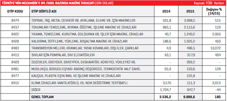 n bu rakam 2015 yılında 3 milyon dolar seviyesinde kaydedildi. Söz konusu mal grubunda 2015 yılında ihracat yüzde 515 arttı. Listenin ikinci sırasında bulunan tohumları temizleme, ayırma, öğütme, işleme makine ve cihazları ürün grubunda 2015 yılında gerçekleştirilen ihracatın değeri 2,1 milyon dolar olarak kaydedildi. 2014 yılında bu rakam 965 bin dolardı. Tohumları temizleme, ayırma, öğütme, işleme makine ve cihazları ürün grubundaki ihracat yüzde 119 arttı. Türkiye’nin Mozambik’e makine ihracatında ilk 10 ürün grubu listesinin üçüncü sırasında ise yıkama, temizleme, kurutma, doldurma vb. işler için makine, cihazlar bulunuyor. 2014 yılında söz konusu kalemde 40 bin dolarlık ihracat gerçekleştirilirken bu rakam, 2015 yılında yüzde 2,950 artarak 1,2 milyon dolar olarak kaydedildi. 2015 yılında Türkiye’nin Mozambik’e yönelik ihracatında en fazla artış yüzde 10,072 ile transmisyon milleri, kranklar, yatak kovanları, dişliler, çarklar kaleminde gerçekleşti. 2014 yılında söz konusu kalemde Mozambik’e 4 bin dolarlık ürün gönderilirken 2015 yılında bu rakam 495 bin dolar olarak kayda geçti.