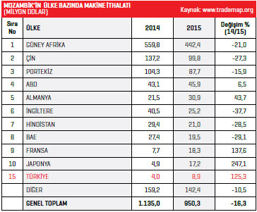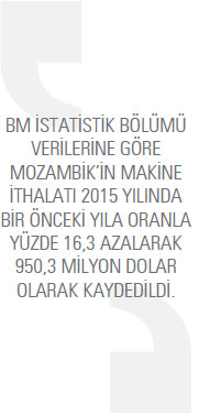 15 yılında bir önceki yıla oranla yüzde 16,3 azalarak 950,3 milyon dolar olarak kaydedildi. 2014 yılında bu rakam 1,1 milyar dolar seviyesindeydi. 2015 yılı rakamlarına göre Mozambik’in en fazla makine ithal ettiği ilk 10 ülke listesinin ilk sırasında Güney Af