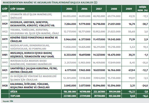 Makine ve aksamları ithalatı 2009 yılında Makedonya’nın genel ithalatından yüzde 16 pay aldı. Makedonya’nın 84. fasıl bazında makine ithalatı 2009 yılında yüzde 9,7 artarak 435 milyon dolar seviyesinde kaydedildi. Çin, İtalya, Almanya ve Türkiye makine ithal ettiği başlıca ülkelerdir. Türkiye, Makedonya’nın makine ithal ettiği ülkeler arasında 23 milyon dolar ile 4. sırada yer alıyor. Makedonya’nın 2009 yılında makine ithalatı arasında başlıca kalemler yazı, hesap, muhasebe, bilgi işlem, büro için diğer makine ve cihazların aksamı; iş makineleri ile endüstriyel yıkama makineleridir. Yazı, hesap, muhasebe, bilgi işlem, büro için diğer makine ve cihazların aksamı mal grubu Makedonya’nın 2009 yılında gerçekleştirdiği toplam makine ithalatının yüzde 16’sını oluşturuyor.