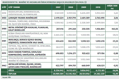 2009 yılında Makedonya’ya makine ve aksamları ihracatımız yüzde 16, 2010 yılında ise yüzde 13 azaldı. Makedonya’dan makine ithalatımız da 2010 yılında yüzde 85 azalarak 295 bin dolar seviyesine geriledi. Makedonya’ya 84. fasıl itibariyle gerçekleştirilen makine ihracatımız incelendiğinde 2010 yılında en fazla sırasıyla buzdolapları, dondurucular, soğutucular, ısı pompaları; çamaşır yıkama makineleri ile yıkama, temizleme, kurutma, doldurma ve benzeri işler için makine, cihaz ihracatı gerçekleşti. 2010 yılında Türkiye’nin Makedonya’dan 84. fasıl itibariyle en fazla ithal ettiği ürün grupları sırasıyla hava-vakum pompası, hava/gaz kompresörü, vantilatör, aspiratör; yıkama, temizleme, kurutma, doldurma ve benzeri işler için makine, cihaz ile kendine özgü fonksiyonlu makine ve cihazlar oldu.