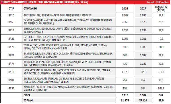 fazla makine ihraç ettiği ülkeler listesinde 1,1 milyon dolarla beşinci sırada yer aldı. Arnavutluk’un Türkiye’ye yönelik makine ihracatı 2016 yılında bir önceki yıla oranla yüzde 732,8 artarken, Arnavutluk, 2016 yılında 84. fasıl itibarıyla en fazla ağır iş makine ve cihazlarının aksam ve parçaları kaleminde ihracat gerçekleştirdi. 2015 yılında söz konusu ürün grubunda 1,4 milyon dolarlık ürün ihraç edilirken 2016 yılında bu rakam, yüzde 171,9 artarak 4 milyon dolar seviyesinde kaydedildi. Listenin ikinci sırasında ise yazı, hesap, muhasebe, bilgi işlem, büro için diğer makine ve cihazların aksamı ürün grubu bulunuyor. Söz konusu kalemde 2015 yılında gerçekleştirilen ihracatın değeri 1,6 milyon dolarken, 2016 yılında bu rakam yüzde 40 artarak 2,3 milyon dolar seviyesinde kayda geçti. Listenin üçüncü sırasında bulunan kaldırma, istifleme, yükleme, boşaltma makine ve cihazları kaleminde de 2015 yılında 991 bin dolar değerindeki ihracat 2016’da yüzde 115,4 artışla 2,1 milyon dolara yükseldi. Arnavutluk’un 2016 yılında bir önceki yıla oranla ihracatını en fazla artırdığı ürün grubu ise yüzde 2 bin 80 ile metal dökümü için kasalar, plakalar, kalıp modelleri oldu.