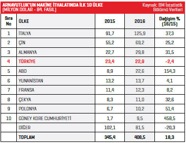 Benzer şekilde, BM İstatistik Bölümü verilerine göre Arnavutluk’un makine ithalatı 2016 yılında bir önceki yıla oranla yüzde 18,3 artarak 408,5 milyon dolar olarak kaydedildi. Arnavutluk 2015 yılında 345,4 milyon dolarlık ithalat gerçekleştirmişti. 2016 yılı rakamlarına göre Arnavutluk’un en fazla makine ithal ettiği ilk 10 ülke listesinin ilk sırasında 125,9 milyon dolarla İtalya yer alıyor. İtalya’dan 2016 yılında ithal edilen makinelerin değeri 91,7 milyon dolardı.