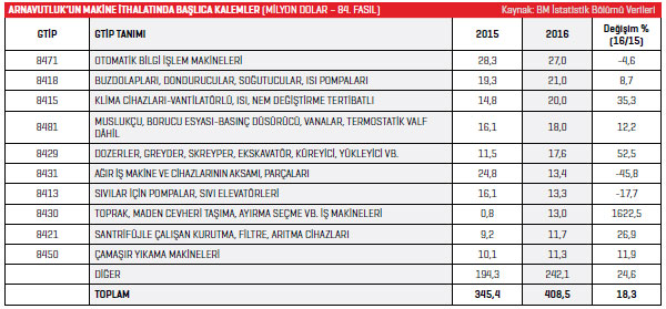 Arnavutluk’un İtalya’dan gerçekleştirdiği ithalat yüzde 37,3 artarken, 2015 yılında listenin ikinci sırasında bulunan Çin’den 55,2 milyon dolar değerinde makine ithal eden Arnavutluk, 2016 yılında bu rakamı yüzde 25,2 artışla 69,2 milyon dolara yükseltti. Listesinin üçüncü sırasındaki Almanya’dan 2015 yılında 22,7 milyon dolarlık ithalat gerçekleştirilirken, 2016 yılında bu rakam yüzde 31,5 artışla 29,8 milyon dolar oldu. Türkiye ise 22,9 milyon dolarla 2016 yılında Arnavutluk’un en fazla makine ithal ettiği ülkeler listesinin dördüncü sırasında yer aldı. Arnavutluk, 2016 yılında en fazla otomatik bilgi işlem makineleri kaleminde ürün ithal etti. 2015 yılında söz konusu ürün grubunda 28,3 milyon dolarlık ithalat gerçekleştirilirken 2016 yılında bu rakam yüzde 4,6 azalarak 27 milyon dolar olarak kayda geçti. Listenin ikinci sırasında buzdolapları, dondurucular, soğutucular, ısı pompaları ürün grubu yer alırken, 2015 yılında söz konusu kalemde 19,3 milyon dolar değerinde makine ithal edilmişti. 2016 yılında bu rakam yüzde 8,7 artışla 21 milyon dolar oldu. Arnavutluk’un en fazla ithalat gerçekleştirdiği üçüncü kalem de 2015 yılında 14,8 milyon dolarlık ithalat gerçekleştirdiği klima cihazları-vantilatörlü, ısı, nem değiştirme tertibatlı ürün grubu oldu.