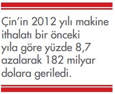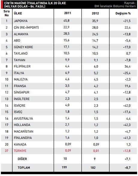 Çin’in makine ithalatı 2012 yılında, bir önceki yıla göre yüzde 8,7 azalarak 182 milyar dolar seviyesine geriledi. 2011 yılında Çin’in ithal ettiği makinelerin değeri 199 milyar dolardı. 2012 yılı rakamlarına göre Çin’in en fazla makine ithal ettiği ülkeler listesinin ilk sırasında 35,9 milyar dolarla Japonya yer alıyor. Çin’in Japonya’dan gerçekleştirdiği ithalat bir önceki yıla göre yüzde 21,5 azaldı. Çin’in 2011 yılında Japonya’dan ithal ettiği makinelerin değeri 45,8 milyar dolardı. Listenin ikinci sırasında re-import yoluyla en fazla ithalat kendi gümrüklerinde gerçekleşti. 2011 yılında 22,9 milyar dolar olan rakam, 2012 yılında yüzde 22,4 artarak 328 milyar dolara yükseldi. Çin’in en fazla ithalat gerçekleştirdiği ülkeler listesinin üçüncü sırasında ise Almanya bulunuyor. Çin 2012 yılında Almanya’dan, 24,5 milyar dolarlık makine ithal etti. Yüzde 13,8 azalan Çin’in Almanya’dan ithalatı, 2011 yılında 28,5 milyar dolardı. Çin’in 2012 yılında, 2011 yılına oranla makine ithalatını en fazla artırdığı ülke Filipinler oldu. Çin, 2011 yılında Filipinlerden 2011 yılında 4,4 milyar dolar değerinde makine ithal ederken 2012 yılında bu rakam yüzde 36,4 artışla 6 milyar dolara yükseldi.
