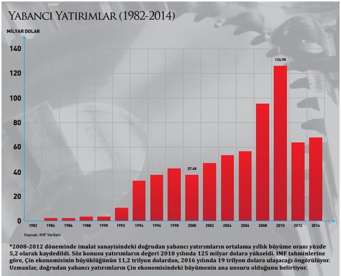 Çin’de işçi ücretlerinin artık eskiden olduğu gibi düşük bir seviyede seyretmemesi ve gelişmiş ülkelerden gelen ihracat talebinin azalmaya başlaması, doğrudan yabancı yatırımlarda azalma olabileceği tahminlerini güçlendirmeye başladı. Fakat artan iç talep, bu yöndeki tahminleri tersine çevirebilir. Çin’deki yabancı yatırımların, hizmet sektöründeki payının yükselen Çin ekonomisinin de etkisiyle giderek artış göstereceği düşünülüyor. Doğu kıyı şeridinde artık ucuz iş gücü bulunamaması ve bu bölgelerin yükselişinin durmaya başlamasıyla yatırımlar artık daha çok ülkenin iç kesimlerine kaymaya başladı. Bu anlamda 2000 yılında, Çin’deki toplam yatırımların yüzde 80’i doğu kıyı şeridinde yapılırken  2017 yılına gelindiğinde bu oranın yüzde 50’ye düşeceği öngörülüyor. 2012 yılında Çin’deki doğrudan yabancı yatırımların değeri 111,7 milyar dolar seviyesine yükseldi. 2007-2012 döneminde imalatsanayisindeki doğrudan yabancı yatırımlarının  ortalama yıllık büyüme oranı yüzde 5,2 olarak kaydedildi. Aynı dönemde ücretlerin yıllık ortalama yüzde 13 artış göstermesi ise yatırımcıları sermaye yoğun sektörlere yatırım yapmaya zorladı.  Çin ticaret politikası gereği tarife ve tarife dışı birçok engel uyguluyor. Tarife dışı engeller, merkezi ve bölgesel düzeyde Ekonomik ve Ticari Komisyon, Devlet Planlama Komisyonu ve Dış Ticaret ve Ekonomik İşbirliği Bakanlığı (MOFTEC)tarafından yürütülüyor. Ülkede vergiler kademeli olarak düşürülmesine rağmen, tarifeler genel görünüş itibarıyla yüksek bulunuyor. Burada temel amaç ithalatın kısıtlanması yoluyla yerel endüstrilerin korunması olarak öne çıkıyor. Çin’de; Shenzhen, Zhuhai, Shantou, Xiamen ve Haiana Adası olmak üzere beş ÖzelEkonomik Bölge (SEZ) bulunuyor.SEZ’lerdeki firmalar bu bölgelerde kullanılmak üzere ithal edilen mallara ilişkin tarife indirimleri ve vergi avantajlarındanyararlanabiliyor. Buna ek olarak 14 “Açık Kıyı Şehri” ve bölgesi, yabancıyatırım projelerine yatırım teşvikleri vermenin yanı sıra, gerekli ekipman ve teknoloji ithalatına da gümrüksüz giriş imkanı sağlıyor. Ayrıca ülkede 200 kadar Ekonomik ve Teknolojik Gelişme Bölgesi bulunuyor. Bu bölgeleryabancı yatırımcılar için çeşitli kolaylıklar sağlıyor.