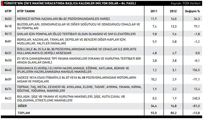 Türkiye’nin 84. fasılda Çin’e gerçekleştirdiği makine ihracatı, 2012 yılında yüzde 12,8 azalarak 80,2 milyon dolar olarak kaydedildi. 2011 yılında bu rakam 92 milyon dolardı. Türkiye’nin Çin’e yönelik makine ihracatının ilk sırasında merkezi ısıtma kazanları (84.02 pozisyonundakiler hariç) ürün grubu yer alıyor. 2011 yılında söz konusu ürün grubunda Çin’e 11,9 milyon dolarlık ihracat gerçekleştirilirken bu rakam, 2012 yılında yüzde 34,3 artışla 16 milyon dolar oldu. Listenin ikinci sırasında bulunan buzdolapları, dondurucular ve diğer soğutucu ve dondurucu cihazlar ve ısı pompaları mal grubunda, 2012 yılı ihracatı bir önceki yıla göre yüzde 79,1 artarak 13,3 milyon dolar seviyesine yükseldi. 2011 yılında bu rakam 7,4 milyon dolardı. Türkiye’nin Çin’e makine ihracatında ilk 10 ürün listesinin üçüncü sırasındaki sıvılar için pompalar (ölçü tertibatı olsun olmasın) ürün grubunda,2011 yılında 9,8 milyon dolarlık ihracat gerçekleştirilirken bu rakam 2012 yılında 1,8 azalarak 9,6 milyon dolar olarak kaydedildi. 2012 yılında Türkiye’nin Çin’e makine ihracatında en fazla artış yüzde 156,5 ile dokumaya elverişli elyafın hazırlanması,eğirme, katlama, bükme ve ipliklerin hazırlanmasına mahsus makineler ürün grubunda yaşandı. 2011 yılında söz konusu kalemde 1,2 milyon dolarlık ihracat gerçekleştirilirken bu rakam,2012 yılında 3,1 milyon dolara yükseldi.