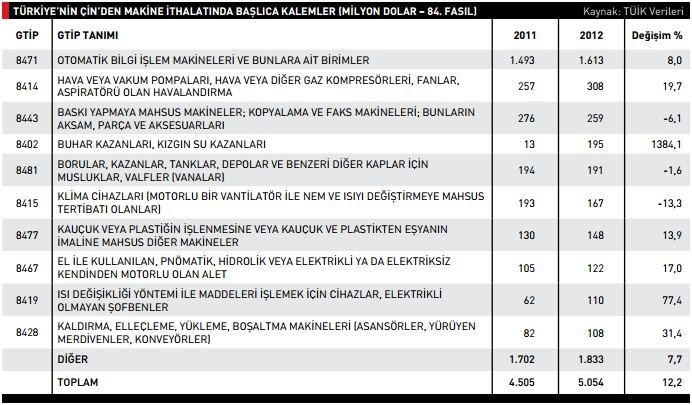 84. fasıl itibariyle 2012 yılında Türkiye’ninÇin’den en fazla ithal ettiği ürün grubu otomatik bilgi işlem makineleri, bunlara ait birimler oldu. Söz konusu ürün grubunda 2011 yılında 1,4 milyar dolar değerinde ithalat gerçekleştirilirken bu rakam, 2012 yılında yüzde 8 artışla 1,6 milyar dolar seviyesine yükseldi. Listenin ikinci sırasında yer alan hava veya vakum pompaları, hava veya diğer gaz kompresörleri,fanlar, aspiratörü olan havalandırma ürün grubunda 2011 yılında 257 milyon dolar değerinde ürün ithal edilirken bu rakam, 2012 yılında yüzde 19,7 artarak 308 milyon dolar seviyesinde kaydedildi. Türkiye’nin Çin’den ithalatında ilk 10 ürün listesinin üçüncü sırasında yer alan baskı yapmaya mahsus makineler;kopyalama ve faks makineleri;bunların aksam, parça ve aksesuarları ürün grubunda 2012 yılında 259 milyon dolarlık ürün ithal edildi. Bir önceki yıla göre ithalatı yüzde 6,1 azalan söz konusu ürün grubundan, 2011 yılında 276 milyon dolarlık ürün ithal edilmişti.Türkiye’nin Çin’den makine ithalatı 2011 yılında 4,5 milyar dolarken bu rakam,2012 yılında yüzde 12,2 artarak 5 milyar dolar değerine yükseldi.
