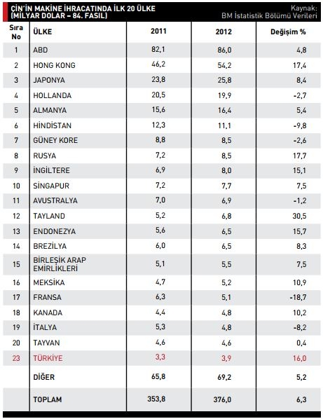Çin’in 2012 yılı makine ihracatı bir önceki yıla göre yüzde 6,3 artarak 376 milyar dolara yükseldi. Çin’in 2011 yılında makine ihracatı 353,8 milyar dolar olarak kaydedilmişti. Çin 2012 yılında en fazla ABD’ye makine ihraç etti. 2011 yılında ABD’ye 82,1 milyar dolarlık ihracat gerçekleştirirken bu rakam 2012 yılında, yüzde 4,8 artışla 86 milyar dolar seviyesine yükseldi. Çin’in en fazla makine ihraç ettiği ikinci ülke Hong Kong oldu. 2012 yılında söz konusu ülkeye 54,2 milyar dolar değerinde ürün ihraç edildi. Yüzde 17,4 artışın olduğu Hong Kong’a, 2011 yılında ihraç edilen makinelerin değeri 46,2 milyar dolardı. Çin’in en fazla makine ihraç ettiği ülkeler listesinin üçüncü sırasında ise Japonya yer alıyor. Japonya’ya 2011 yılında 23,8 milyar dolar değerinde ürün gönderilirken bu rakam, 2012 yılında yüzde 4 artışla 25,8 milyar dolar oldu. Çin’in 2012 yılında bir önceki yıla oranla makine ihracatını en fazla artırdığı ülke Tayland oldu. Tayland’a 2011 yılında 5,2 milyar dolarlık ihracat gerçekleştiren Çin’in, 2012 yılında söz konusu ülkeye ihracatı yüzde 30,5 artışla 6,8 milyar dolar seviyesine yükseldi. Çin’in Türkiye’ye yönelik makine ihracatı 2011 yılında 3,3 milyar dolar seviyesindeyken bu rakam 2012 yılında yüzde 16 artışla 3,9 milyar dolar oldu. Türkiye, Çin’in en fazla makine ihraç ettiği ülkeler listesinin 23. sırasında yer alıyor.