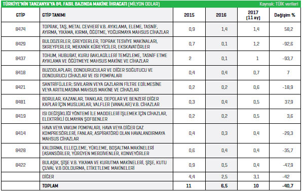 küreyici, yükleyici ürün grubu bulunuyor. Tanzanya, 2015 yılında söz konusu kalemde 59,4 milyon dolar değerinde makine ithal ederken, 2016 yılında bu rakam yüzde 13,4 artışla 67,4 milyon dolar oldu. Tanzanya’nın en fazla ithalat gerçekleştirdiği üçüncü