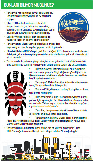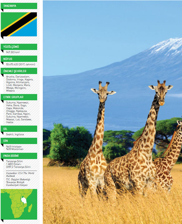 Tanzanya, 883 bin 749 kilometrekare yüz ölçümü ve 45 milyona yaklaşan nüfusuyla Doğu Afrika’nın en büyük ülkelerinden biri. Doğusunda Hint Okyanusu’nun yer aldığı ülke Mozambik, Malavi, Zambiya, Kongo...