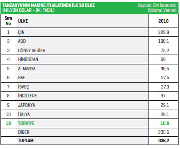BM İstatistik Bölümü verilerine göre Tanzanya’nın makine ithalatı 2016 yılınyılında bir önceki yıla oranla yüzde 1,2 azalarak 936,2 milyon dolar olarak kaydedildi. Tanzanya 2015 yılında 947,8 milyon dolarlık ithalat gerçekleştirmişti. 2016 yılı rakamlarına göre Tanzanya’nın en fazla makine ithal ettiği ilk 10 ülke listesinin ilk sırasında 229,9 milyon dolarla Çin yer alıyor. Tanzanya, 2016 yılında listenin ikinci sırasında bulunan ABD’den 100,1 milyon dolar değerinde makine ithal etti. Tanzanya’nın 2016 yılında en fazla makine ithal ettiği ilk 10 ülke listesinin üçüncü sırasında ise 75,2 milyon dolarla Güney Afrika yer alıyor. İthalat listesinin dördüncü ve beşinci sırasındaysa Hindistan ve Almanya bulunuyor. Tanzanya 2016 yılında Hindistan’dan 69 milyon dolarlık makine ithal ederken, beşinci sıradaki Almanya’dan gerçekleştirdiği makine ithalatı 46,5 milyon dolar oldu. Türkiye, 10,9 milyon dolarla 2016 yılında Tanzanya’nın en fazla makine ithal ettiği ülkeler listesinin 19’uncu sırasında bulunuyor.