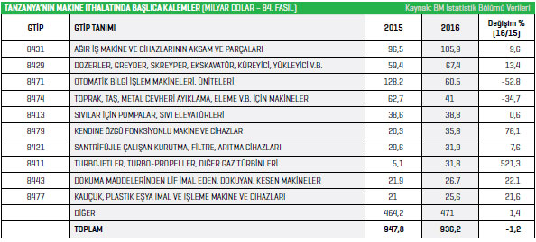 Tanzanya 2016 yılında en fazla ağır iş makine ve cihazlarının aksam ve parçaları kaleminde ürün ithal etti. 2015 yılında söz konusu ürün grubunda 96,5 milyon dolarlık ithalat gerçekleştirilirken 2016 yılında