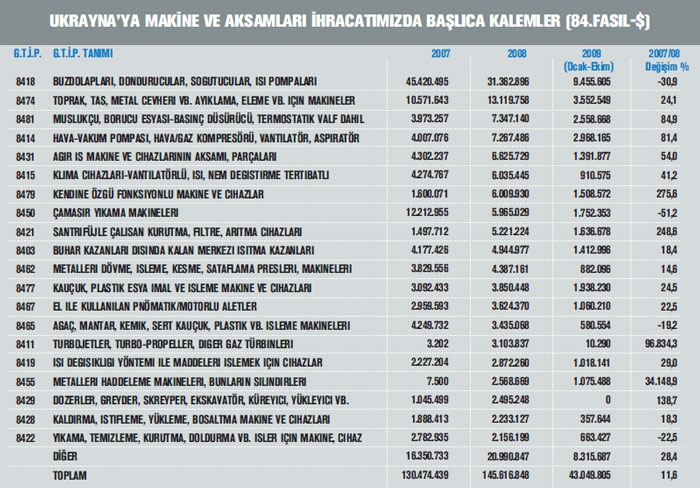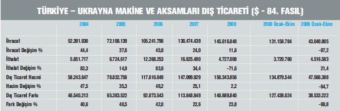 2008 yılında ülkemizin 84. fasıl itibariyle makine ve aksamları sektörü ihracatında 18. sırada bulunan Ukrayna sektör ihracatımızdan yüzde 1,42 pay almıştır. Anılan yılda Ukrayna’ya makine ve aksamları ihracatımız yüzde 11,6 artarak 145,6 milyon dolara yükselmiş; Ukrayna’dan ithalatımız ise yüzde 71,6 oranında azalarak 4,7 milyon dolara gerilemiştir. 2004-2008 yılları arasında ise; Ukrayna ile Türkiye arasındaki makine ve aksamları dış ticaret hacmi 2,5 kat artış sergilerken, bu dönemde iki ülke arasındaki dış ticaret ülkemiz lehine fazla vermiştir. 2004-2008 döneminde, Ukrayna’ya yönelik makine ihracatımız sürekli artmış, ithalatımız da ise 2008 yılında düşüş kaydedilmiştir. Ancak, 2008-2009 yılları durumun tersine döndüğü, ihracatımız azalırken ithalatımızın arttığı gözlemlenmektedir. 84. fasıl itibariyle sektör ihracatında önemli yer tutan kalemler pozisyon bazı nda incelendiğinde 2008 yılında; ilk sı- rada 8418 no’lu GTİP altında tanımlanan “buzdolapları, dondurucular, soğutucular, ısı pompaları”, ikinci sırada 8474 no’lu GTİP altında tanımlanan “toprak, taş, metal cevheri vb. ayıklama, eleme vb. için makineler”, üçüncü sırada ise 8481 no’lu GTİP altında tanımlanan “muslukçu, borucu eşyası-basınç düşürücü, termostatik valf dahil”in yer aldığı görülmektedir. 2008 yılında pozisyon bazında Türkiye’nin Ukrayna’dan 84. fası l itibariyle en fazla ithal ettiği ürün grupları sırasıyla, “turbojetler, turbopropeller, diğer gaz türbinleri”, “diğer motorlar ve kuvvet üreten makineler” ve “kendine özgü fonksiyonlu makine ve cihazlar” olmuştur.